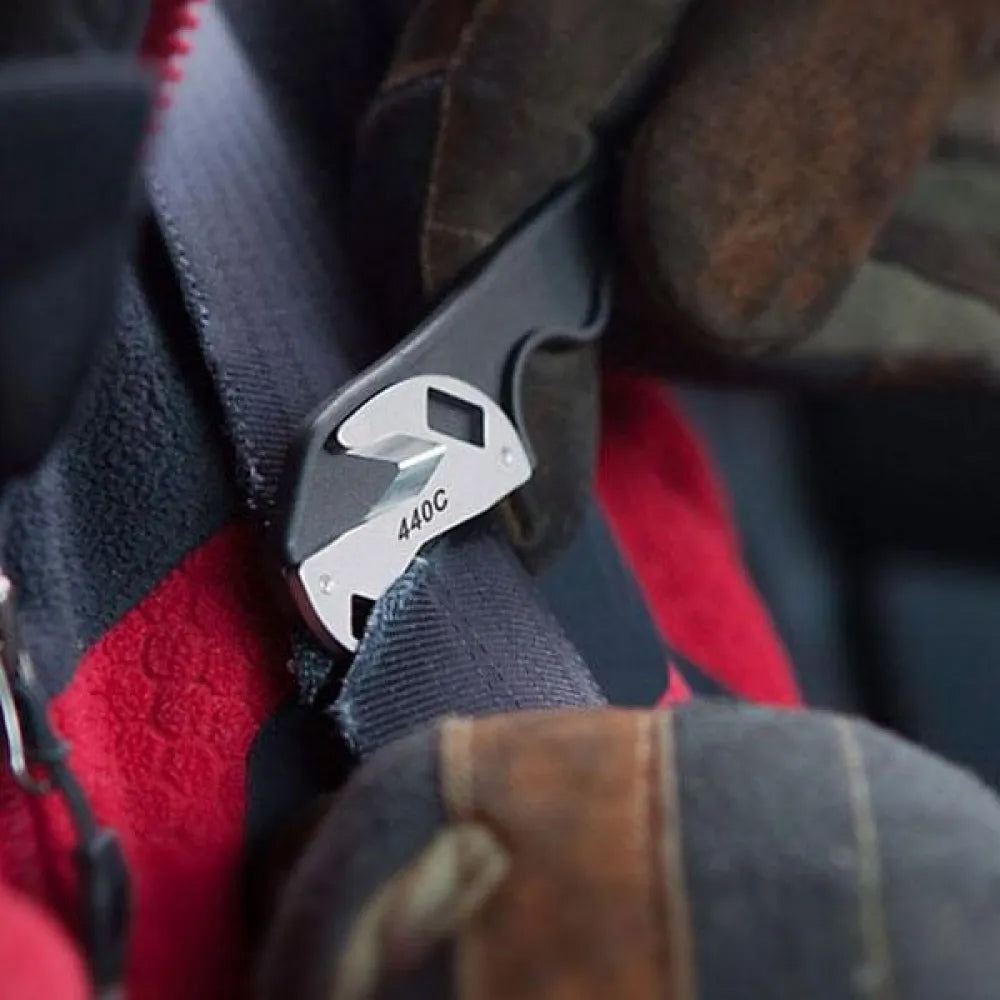 - A reversible and replaceable v-notch cutter made from 440C stainless steel, ideal for cutting through straps, seatbelts, canvas, and other tough materials.