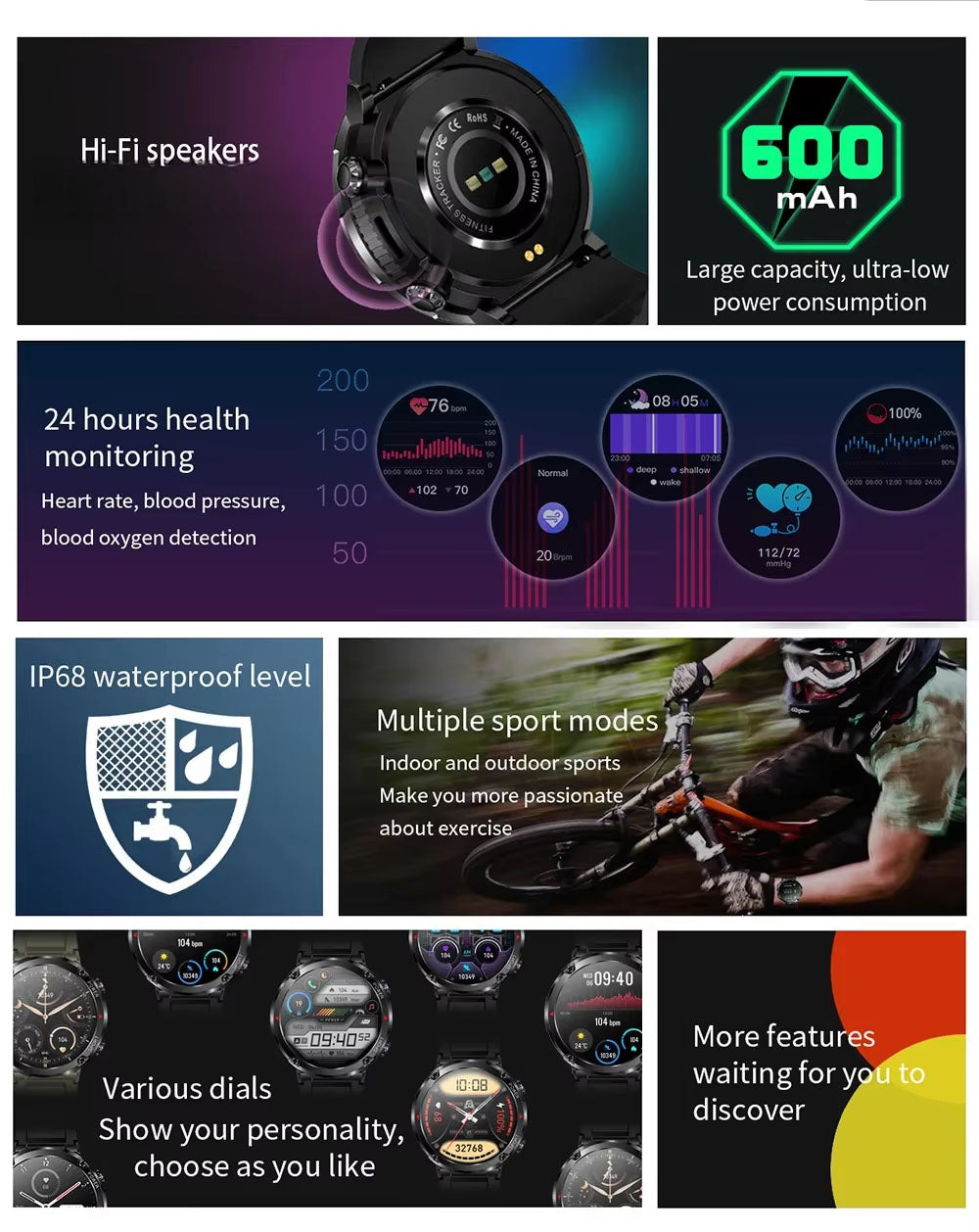 *Health Monitor:heart rate 、Blood pressure、sleep monitor、Blood oxygen measurement、 Breathing training.
