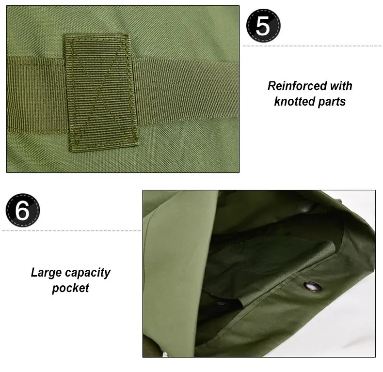 Made from tough 900 tactial oxford water resistant nylon with polyester lining huge capacity 80L and size is 800 x 310 x 310 mm. Durable and Light Weight.