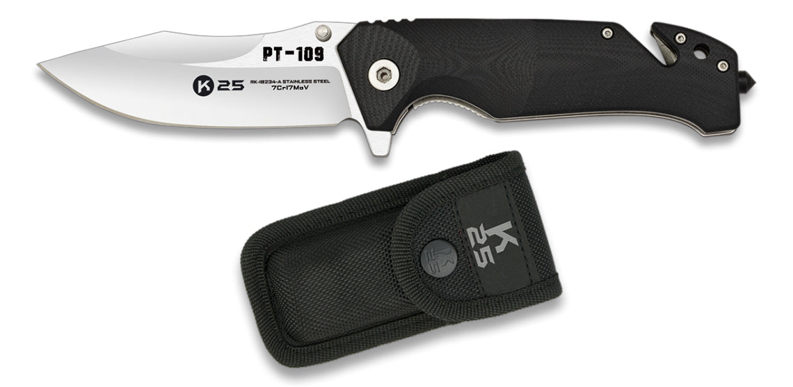 The K25 Folding Knife with Seat Belt Cutter and Window Smasher is a tactical rescue tool designed for emergency situations, manufactured by the Spanish company Martinez Albainox. It features a stainless steel blade (commonly 7Cr17Mov or 3Cr13MoV) with a durable titanium coating, a tungsten-carbide tip glass breaker, and an integrated seat belt cutter.