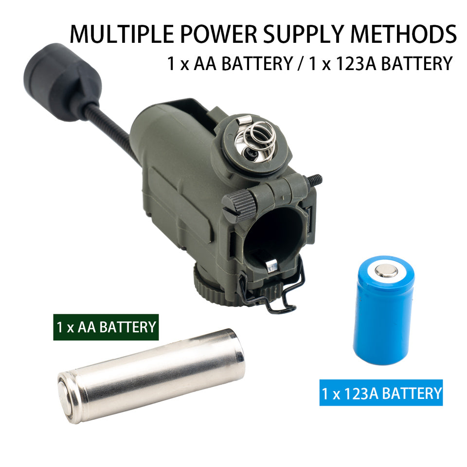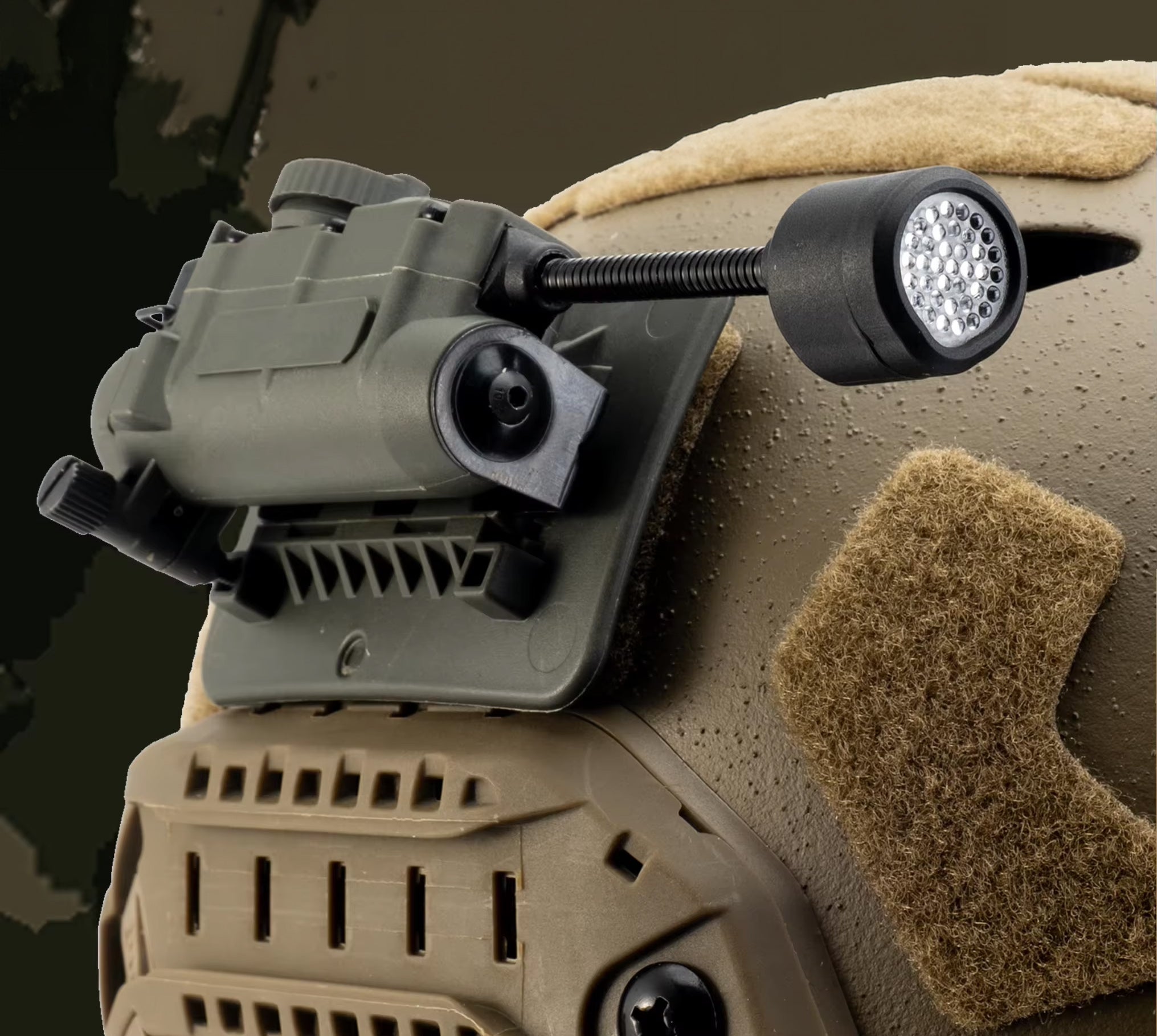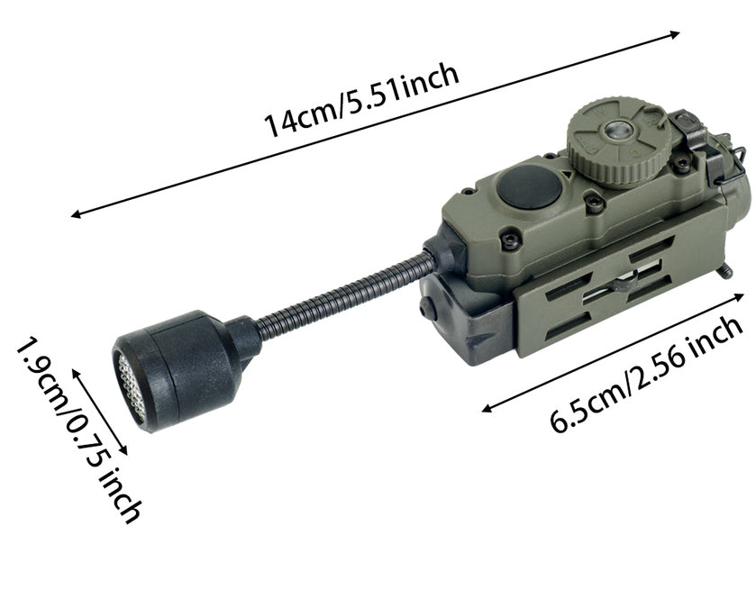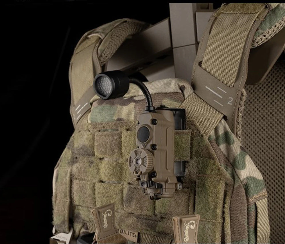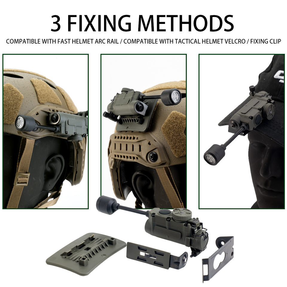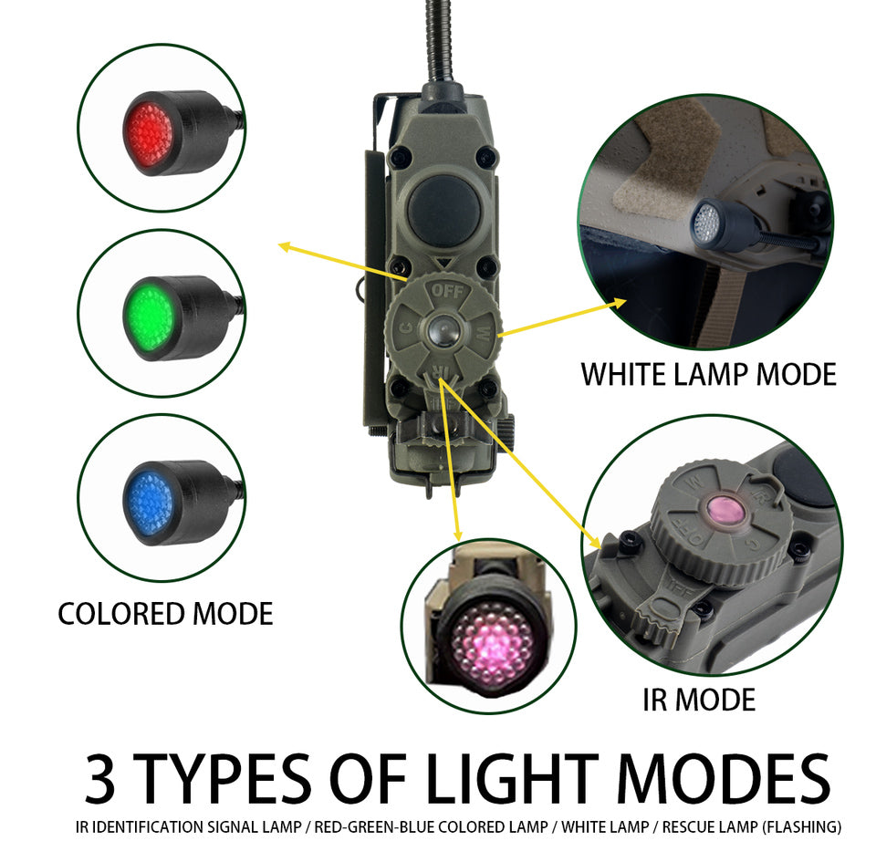 Get covert and reliable hands-free lighting with the RECON GS2 RATTLESNAKE Stalk Helmet Light. This multi-functional military helmet light features 6 LEDs, including white, IR, red, blue, green, and IFF IR to alert friendlies of your presence. A push-button power switch and rotary mode selector make operation quick and easy, while a flexible stalk allows you to focus on your target.Â