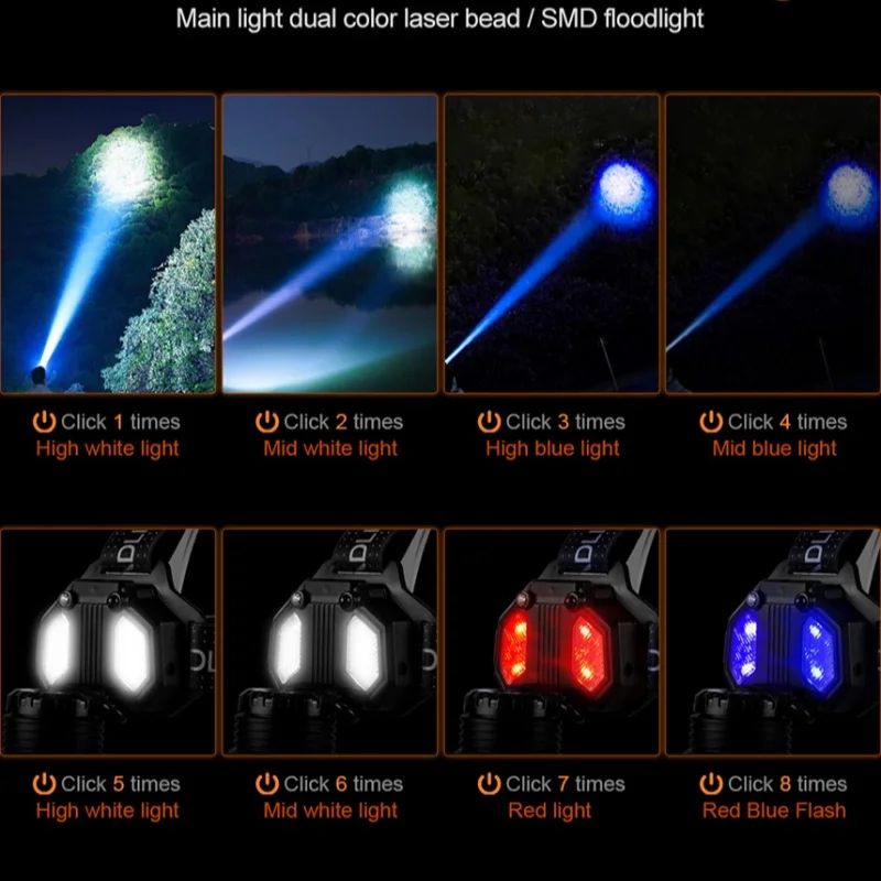 RECON GS2 H-8501-1Ā is aĀ next-generation headlampĀ combiningĀ dual TG white laser beadsĀ withĀ COB/SMD multi-light technologyādelivering up toĀ 10,000 lumensĀ of brilliant output. With bothĀ white and blue laser optionsĀ plusĀ red/blue flash emergency modes, this headlamp is built forĀ professional workers, outdoor adventurers, and safety responders.