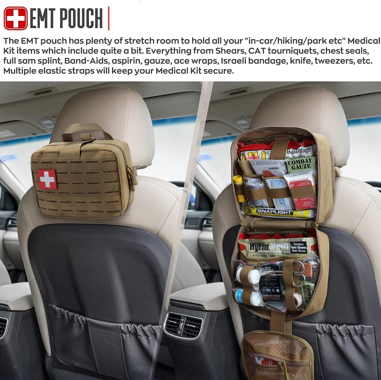 • IFAK Pouch can also be attached to vehicle/truck/car Headrest and MOLLE compatible gear such as a tactical vest, plate carrier, backpack or battle belt.