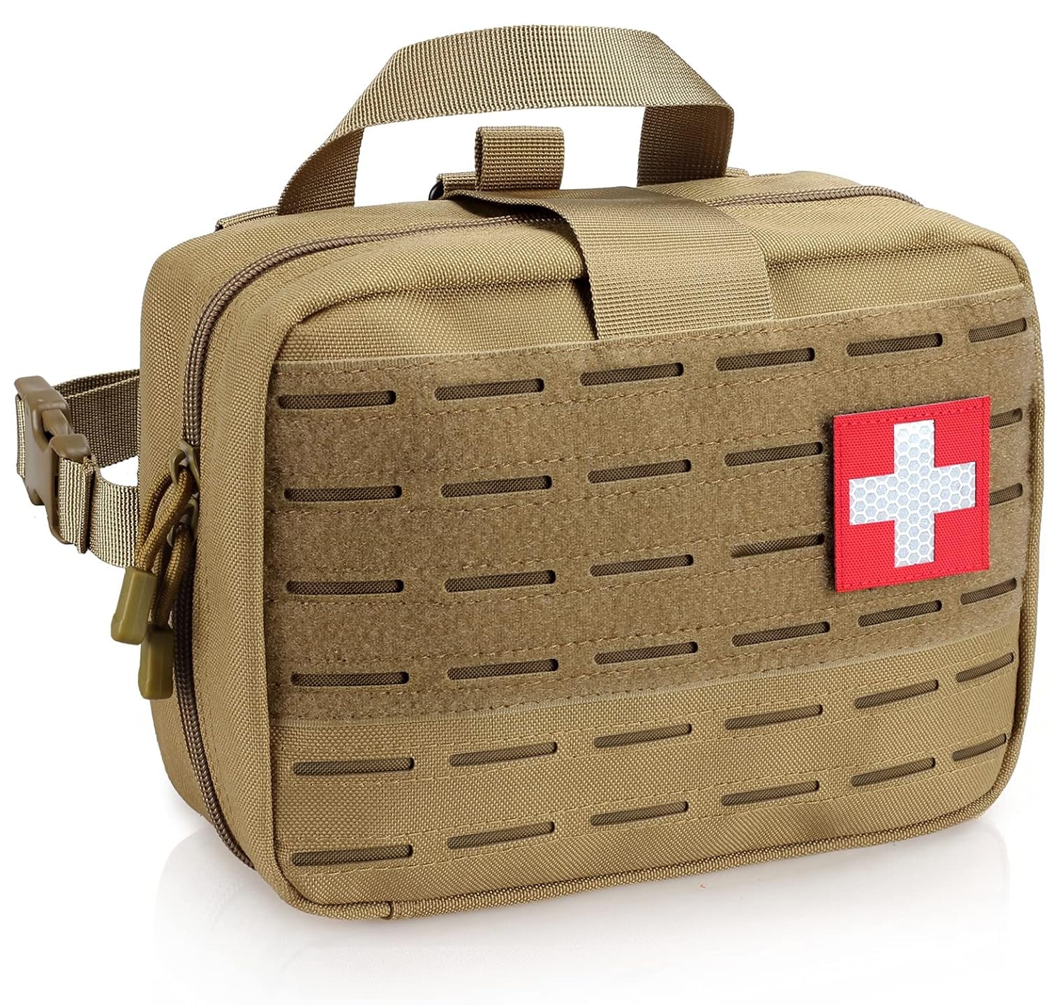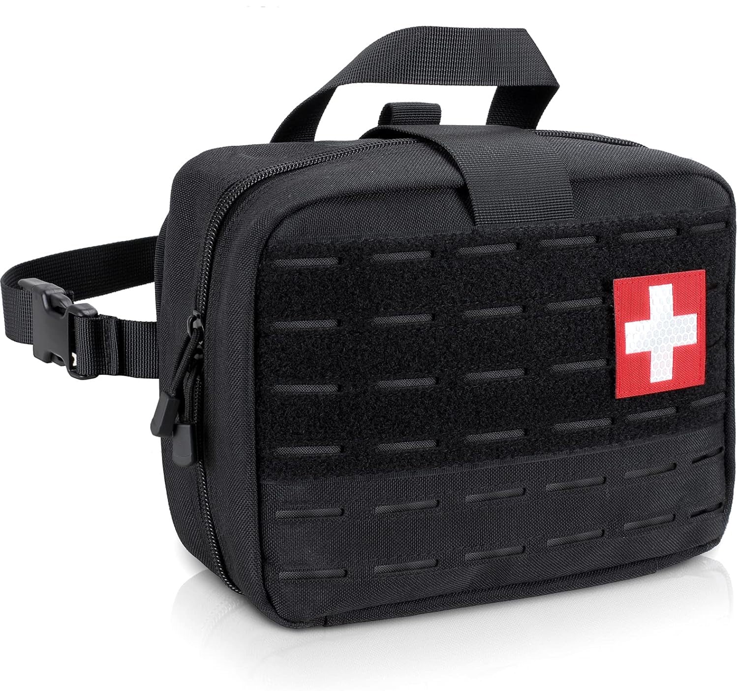 • FRONT LASER-CUT STYLE MOLLE: Tactical IFAK pouch features Laser-Cut MOLLE system with Classical front MOLLE Loop webbings for attaching other tactical accessories and personalized patches. A Flag and Cross Patch is included.