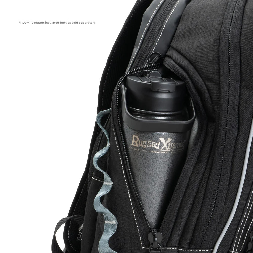 - Fully zippered side pockets for water bottles and thermal mugs. Holds Rugged Xtremes D series water bottles up to the RX11D1100 – 1.1ltr