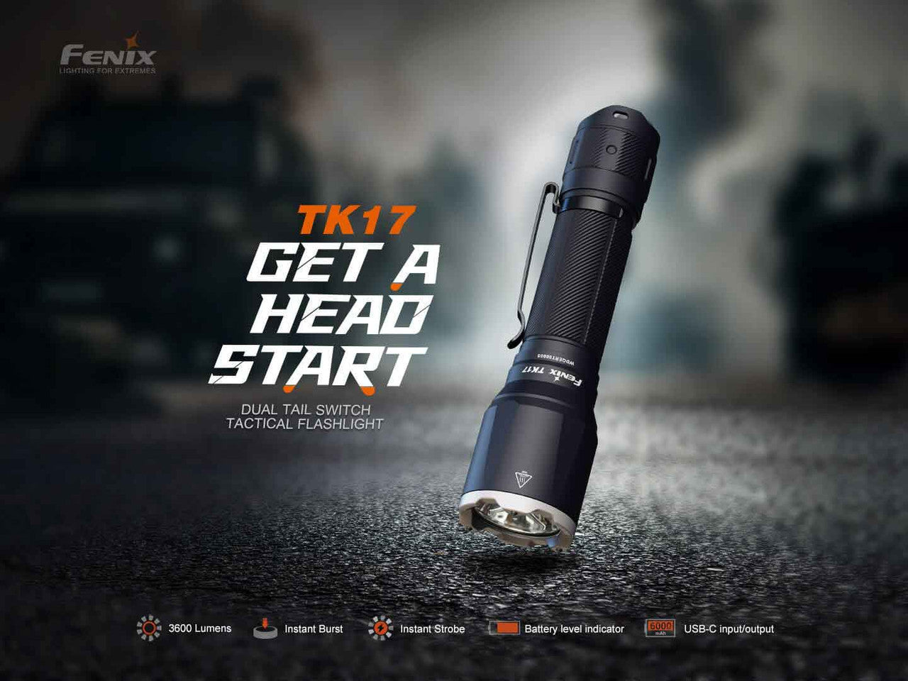 The Fenix TK17 is a powerful and compact tactical torch designed for high-performance use. Featuring a dual switch for instant strobe and burst modes, it delivers an impressive 3600 lumens and up to 60 hours of runtime using the included 6000mAh USB-C rechargeable battery, which also functions as a power bank. A newly upgraded battery level indicator keeps you informed in real-time, making the TK17 an ideal choice for tactical operations, law enforcement, and search-and-rescue missions.