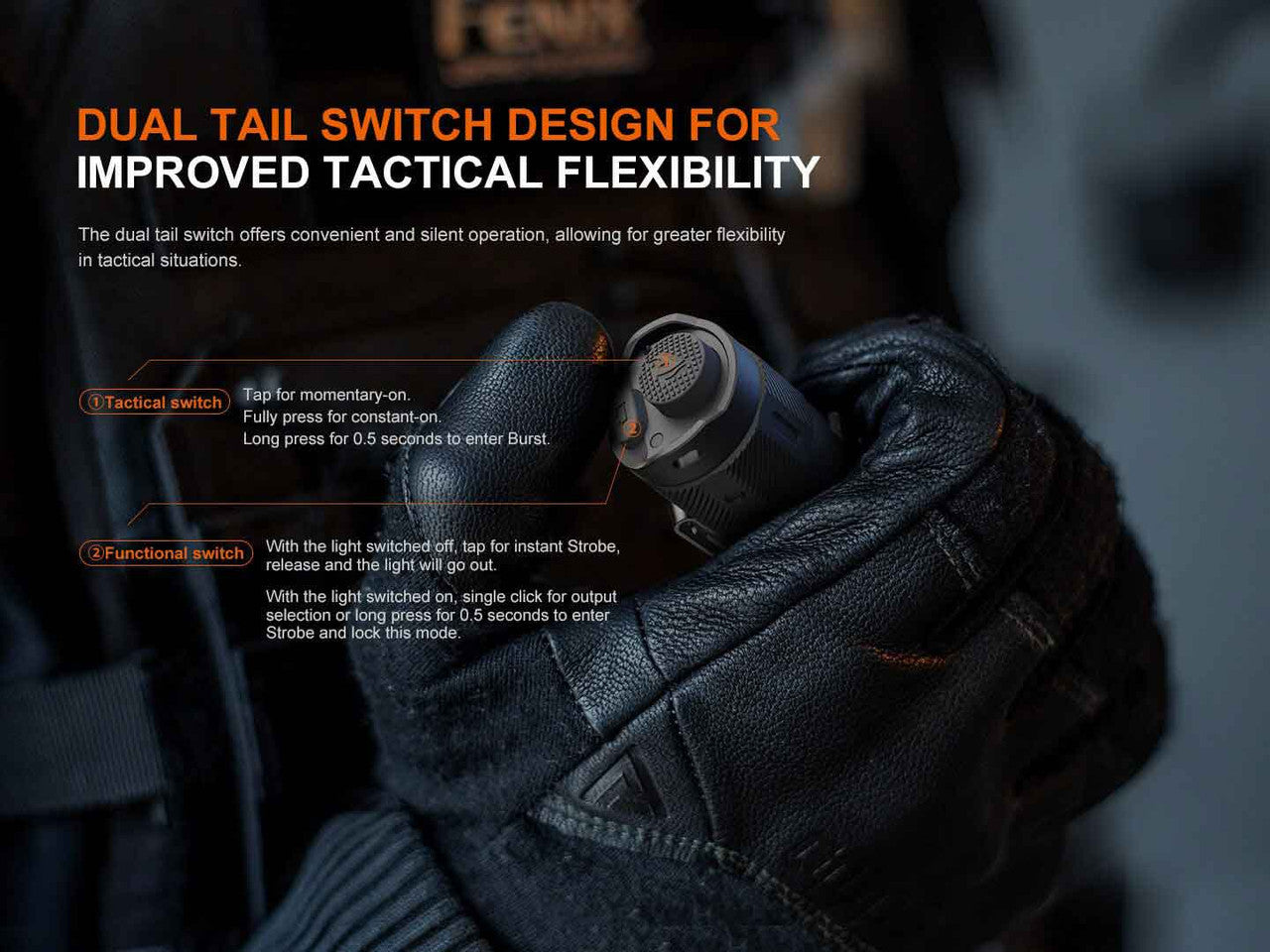 Dual tail switches for instant Burst and Strobe, ideal for tactical or emergency use