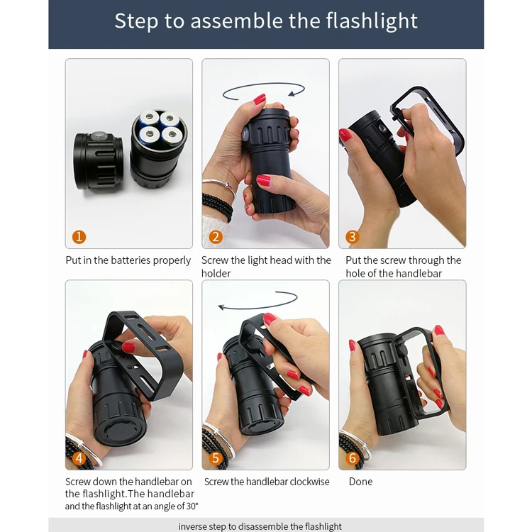 Double pressing switch to adjust the brightness and lighting mode: Left switch for the white light(Strong / Medium/ Weak / Long press for 2 secs to turn off) and the other one for the red & blue light(Red / Red strobe / Blue / Double click for strobe / Long press for 2 secs to turn off) Perfect illumination for outdoor activities and underwater activities.