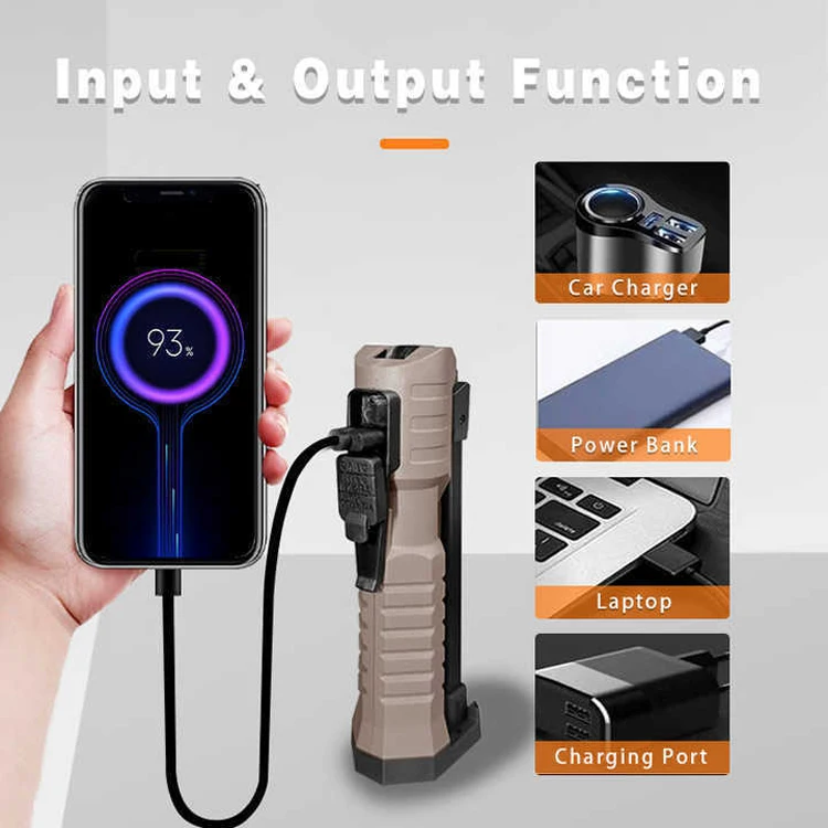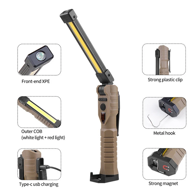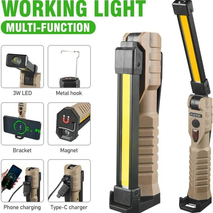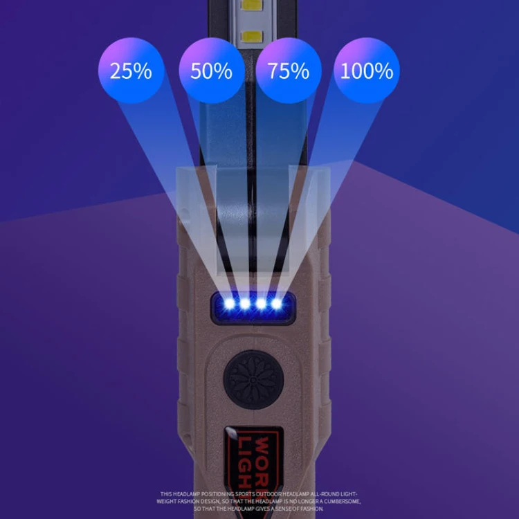 Features: Dual sided COB power display, 3 light sources, USB output, power pack, 180 ° folding up and down, with magnet and hidden hook, convenient for standing and handheld use, better yellow light penetration, red light warning