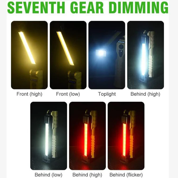 Gear: 7th gear: COB yellow light strong light - COB yellow light COB-XPE strong light - COB white light strong light - COB white light weak light - 9 * COB red light - 9 * COB red light flashing Any gear long press to turn off