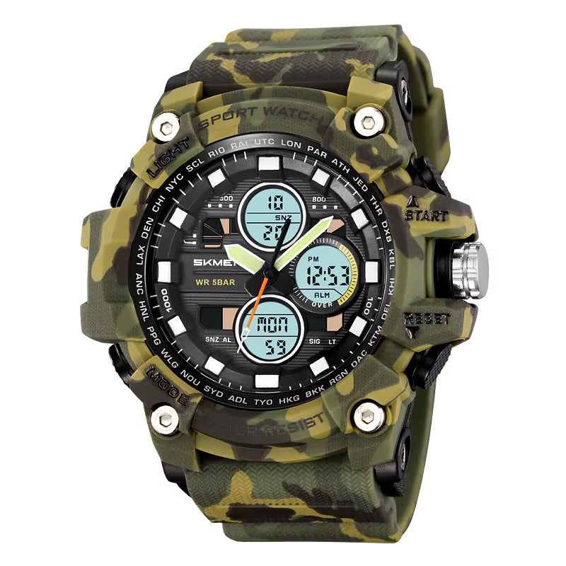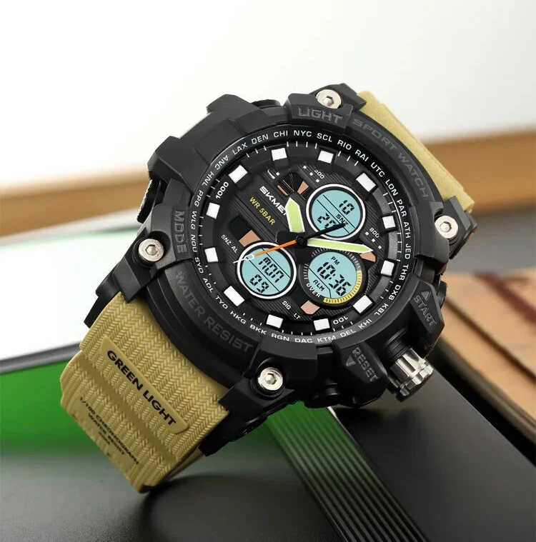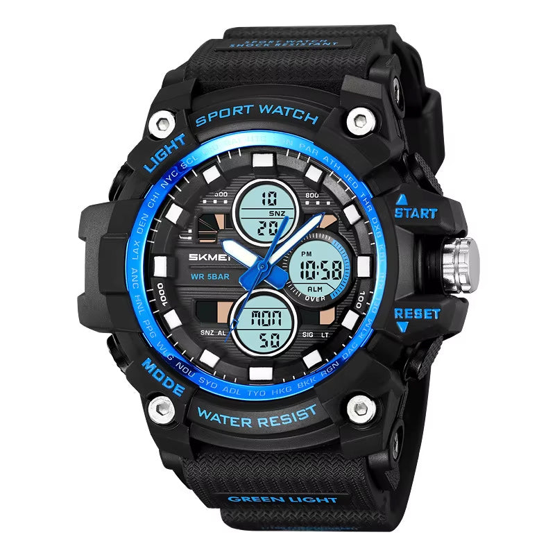 ▪ Function: Three Time Zone, Chronograph, 5 ATM Waterproof, Calendar, Stopwatch, Led light, Date, Week, 12/24 Hour format, Alarm clock, Shockproof