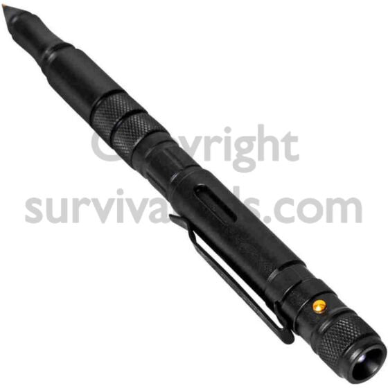 The ultimate 8 in 1 tactical pen tool. One multi-tool for everyday carry. Featuring a bottle opener, saw, flat blade screwdriver, 6mm wrench, black pen, self-defense tool, ultra-strong security glass breaker and hi-strength LED tactical standard and strobe flashlight.